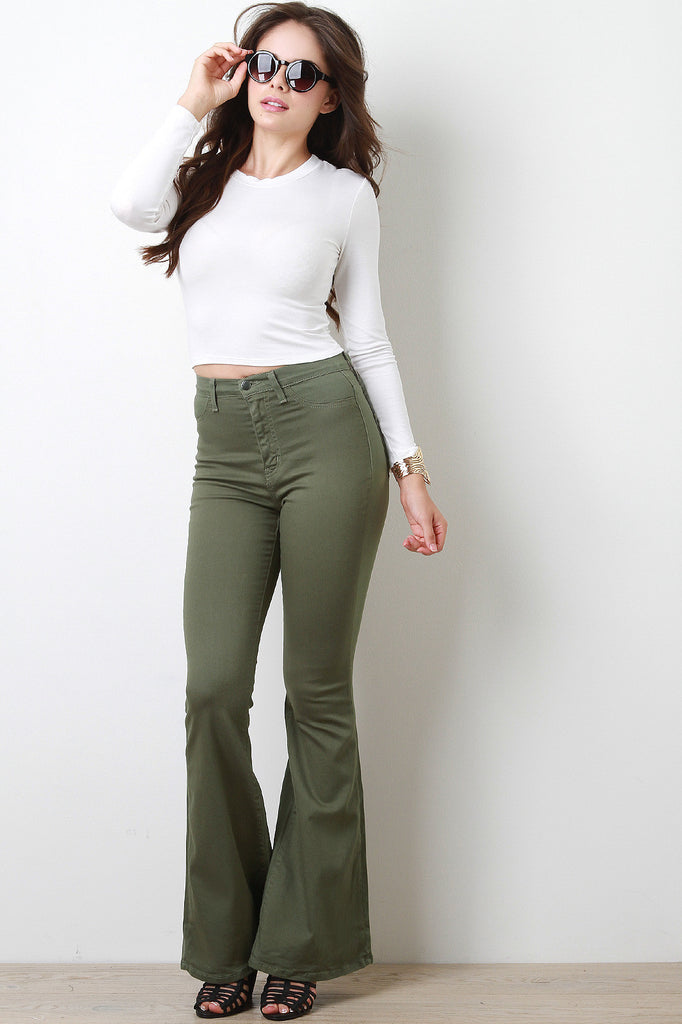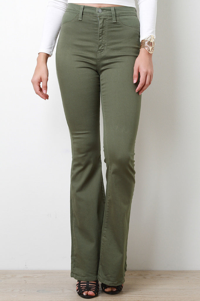 These trendy pants features a high rise design, sculpture fit to flare bell bottoms, faux front pockets, working rear pockets, belt loops, zipper fly, and a single button closure. Accessories sold separately. Made in U.S.A. 96% Cotton, 2% Spandex.