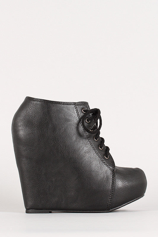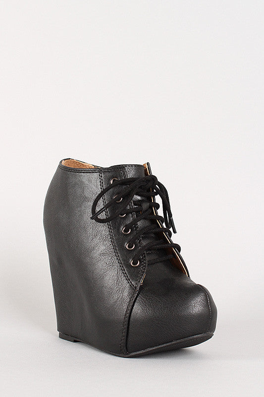Featuring crinkled leatherette upper, almond toe, lace-up front, stitching detail, covered platform and wedge heel. Finished with lightly padded insole.