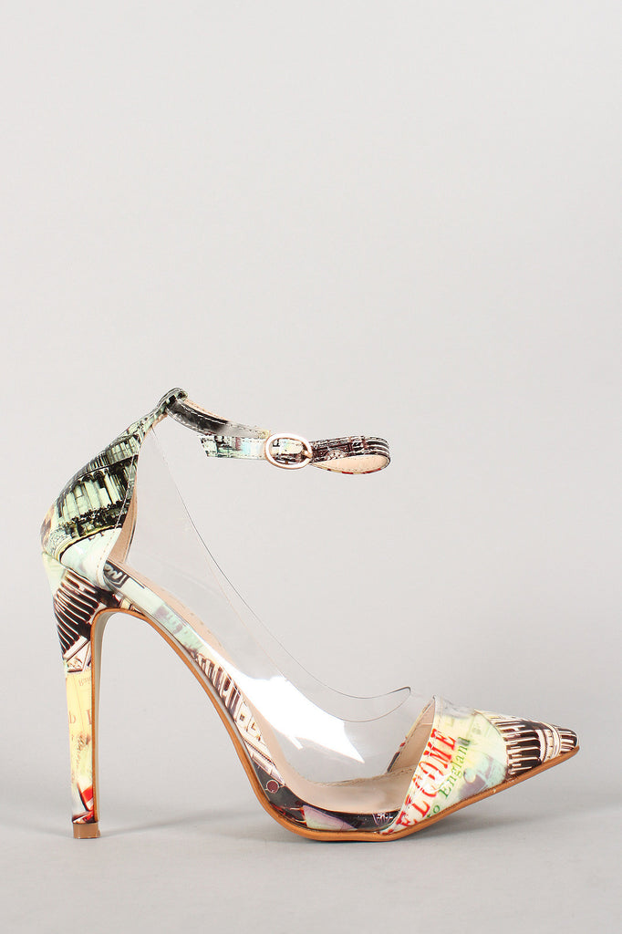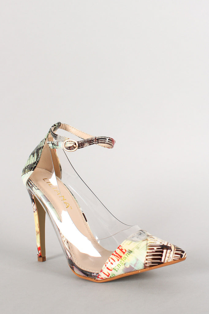 Liliana Graphic Print Lucite Pointy Toe Ankle Strap Pump