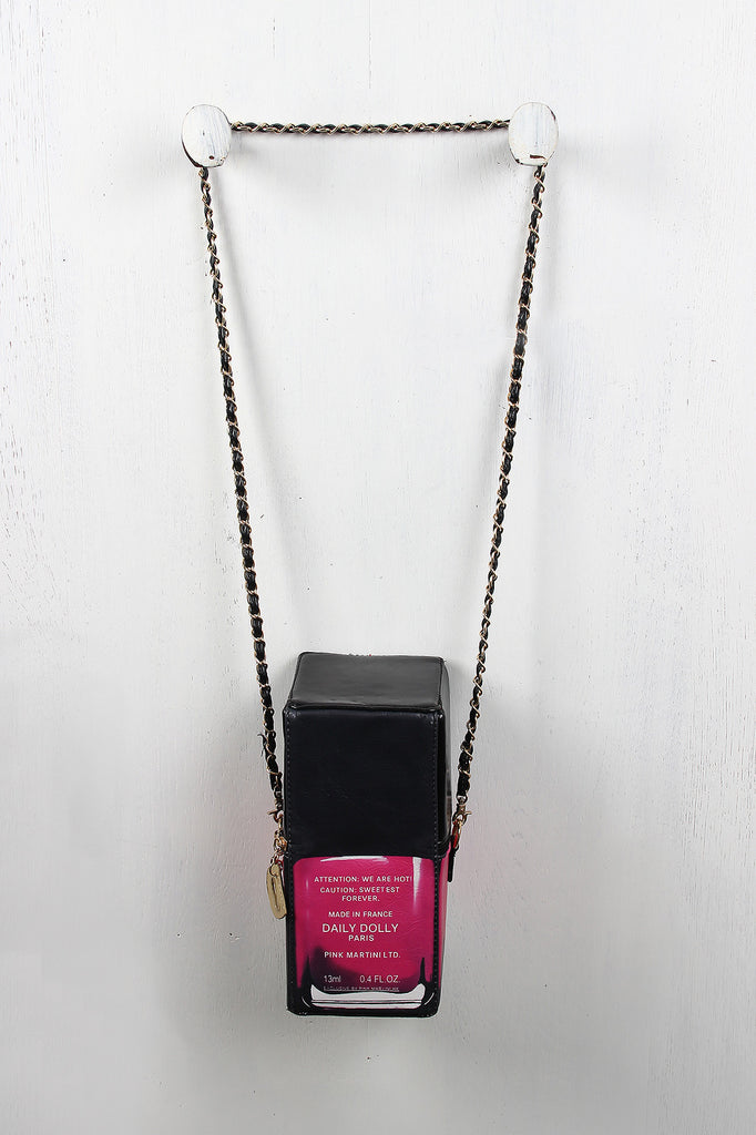A boxy bag with nail polish bottle design, zipper closure, and detachable threaded shoulder chain with 20" drop. Includes metallic leatherette "D" zipper pulls and fully lined interior.