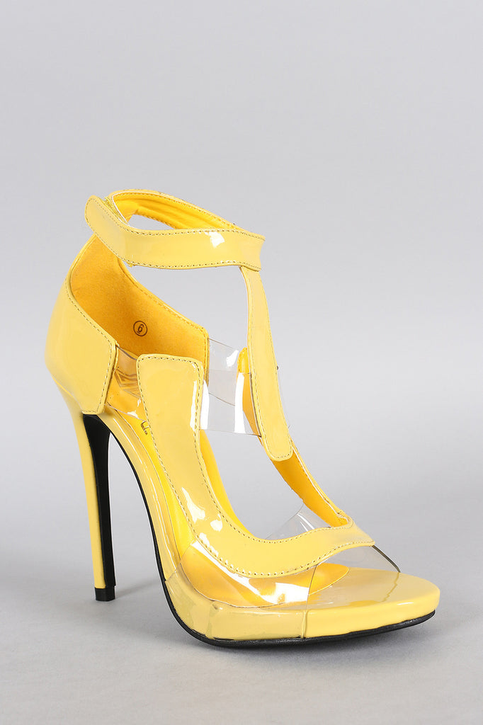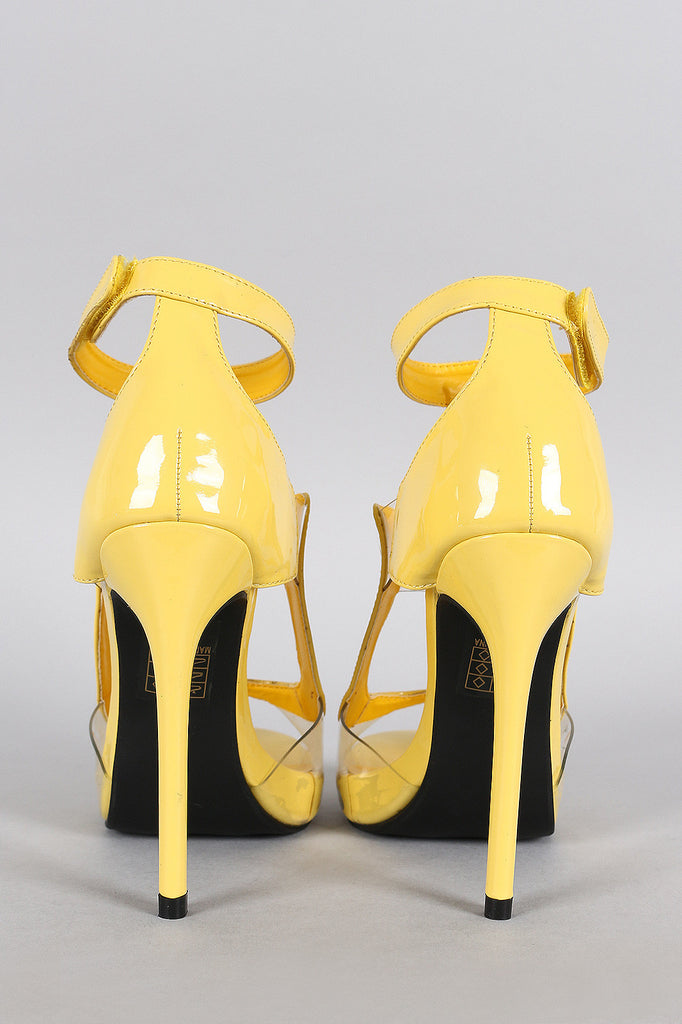 This stylish lucite cut out design upper, low platform, stiletto heel, and lightly padded insole for comfort. Finished with hook and loop fastener.