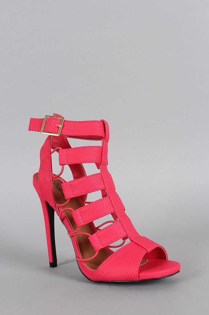 This attractive heel features a snake embossed leatherette upper, caged silhouette, and wrapped stiletto heel. Finished with lightly padded insole and adjustable ankle strap with buckle fastening.