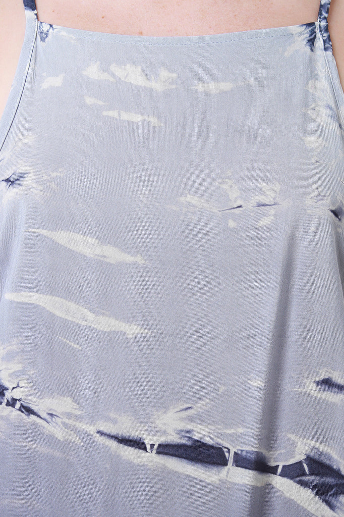 This casual dress features a square neckline, sleeveless, spaghetti shoulder straps, shift cut, side vent slits, and ombre tie dye print. Accessories sold separately. Made in U.S.A. 100% Rayon.