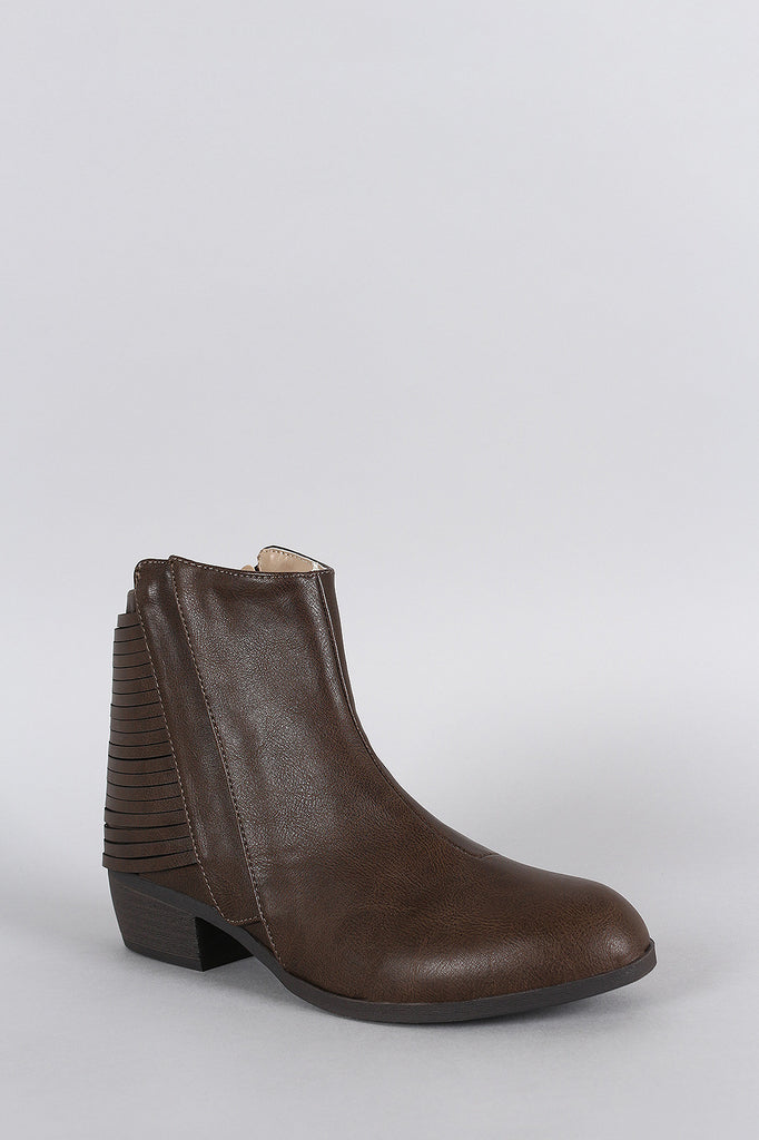 This Western inspired bootie was designed with cut laddered straps along the rear. Features a stacked heel. Finished with a rear zipper for easy on-off.