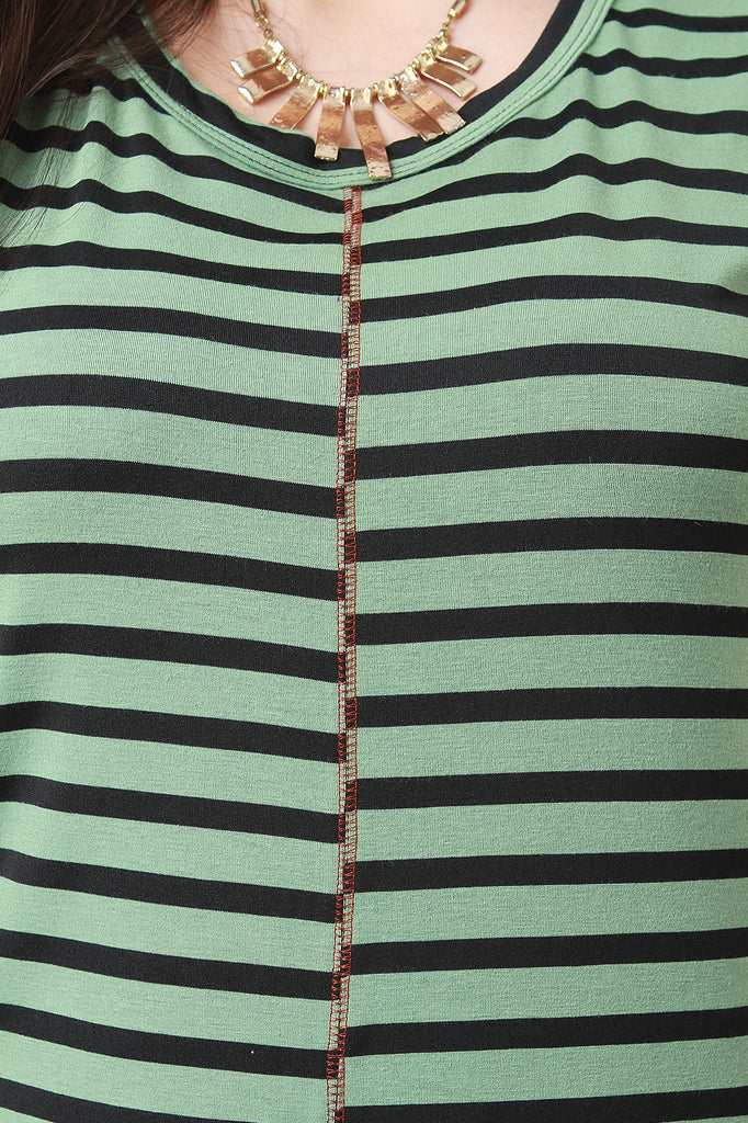 This plus size dress features striped jersey knit, front seam, round neckline, short sleeves, and finished with slight high-low hem. Accessories sold separately. Made in U.S.A. 68% Polyester, 27% Rayon, 5% Spandex.