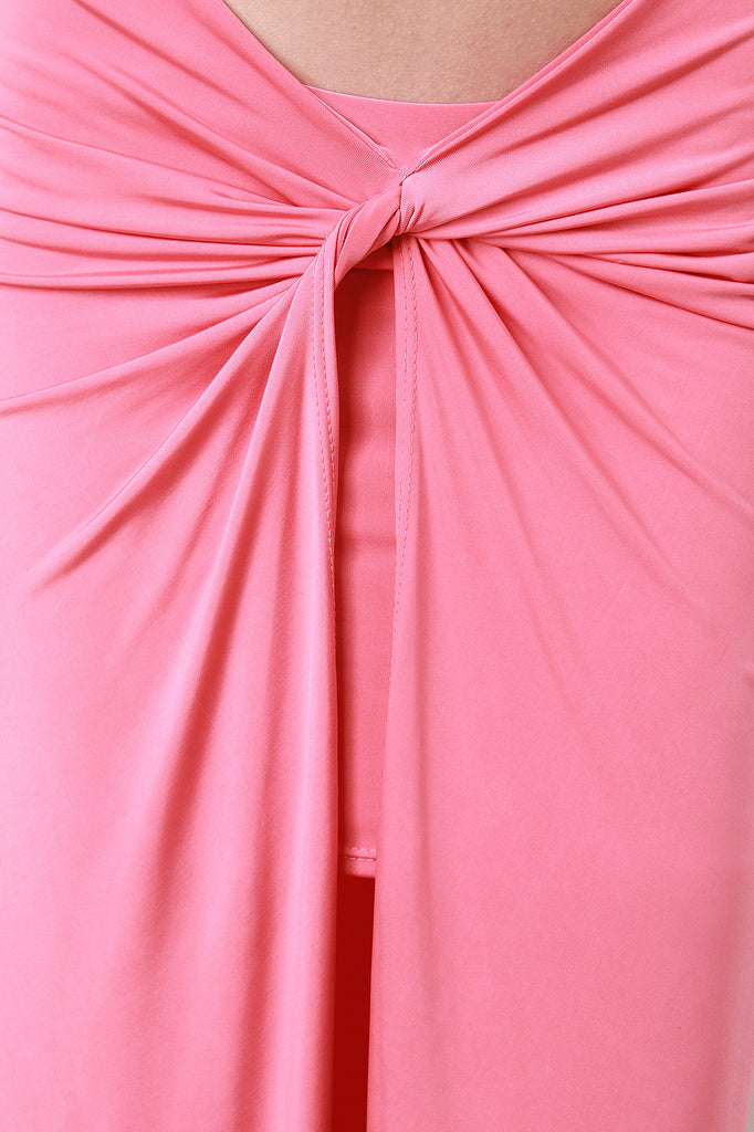 This sexy maxi dress features smooth stretch fabric, criss-crossing halter neck, open midriff with two straps, open back, knotted slit front maxi skirt, and finished with inner mini skirt. Accessories sold separately. Made in U.S.A. 95% Polyester, 5% Spandex.