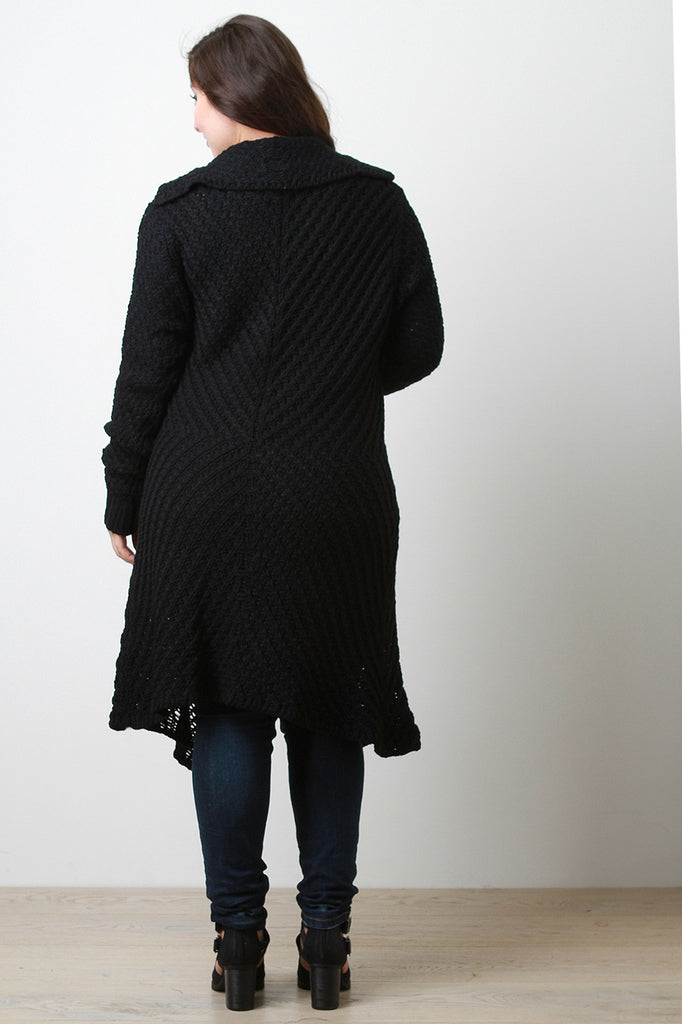 This plus size longline coat is open knit construction. It is notched collar long sleeves bodice. Finished with a button cross over closure and two front patch pockets. Accessories sold separately. 100% Acrylic.