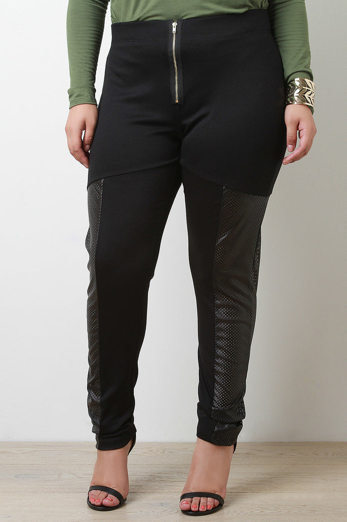 These fitted pants feature a paneled design, perforated vegan leather side panel, and elastic waistband with glossy metallic zipper. Accessories sold separately. Made in U.S.A. Self: 80% Polyester, 15% Rayon, 5% Spandex. CNT: 100% Polyester.