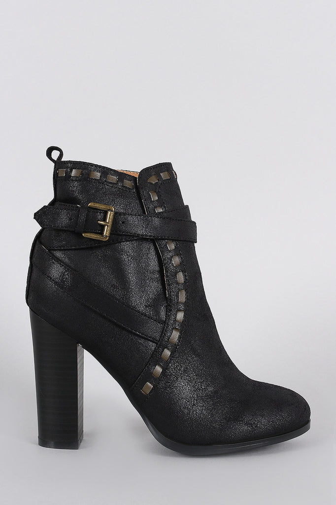 Qupid Distressed Strappy Stitched Thick Heeled Ankle Boots
