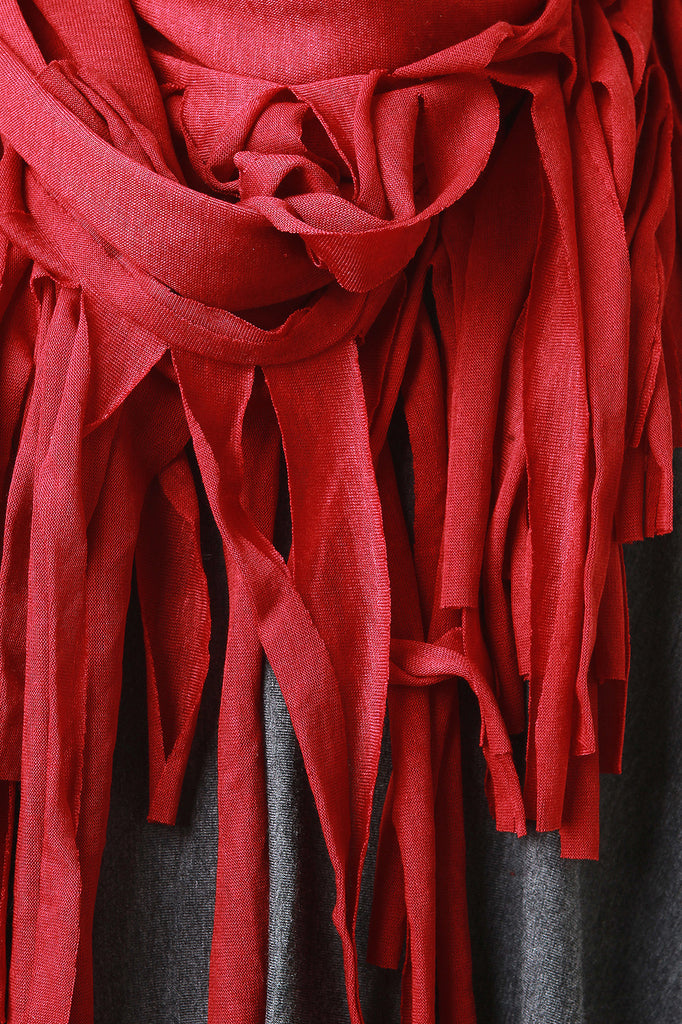 An thin jersey knit infinity scarf with long fringed edges.