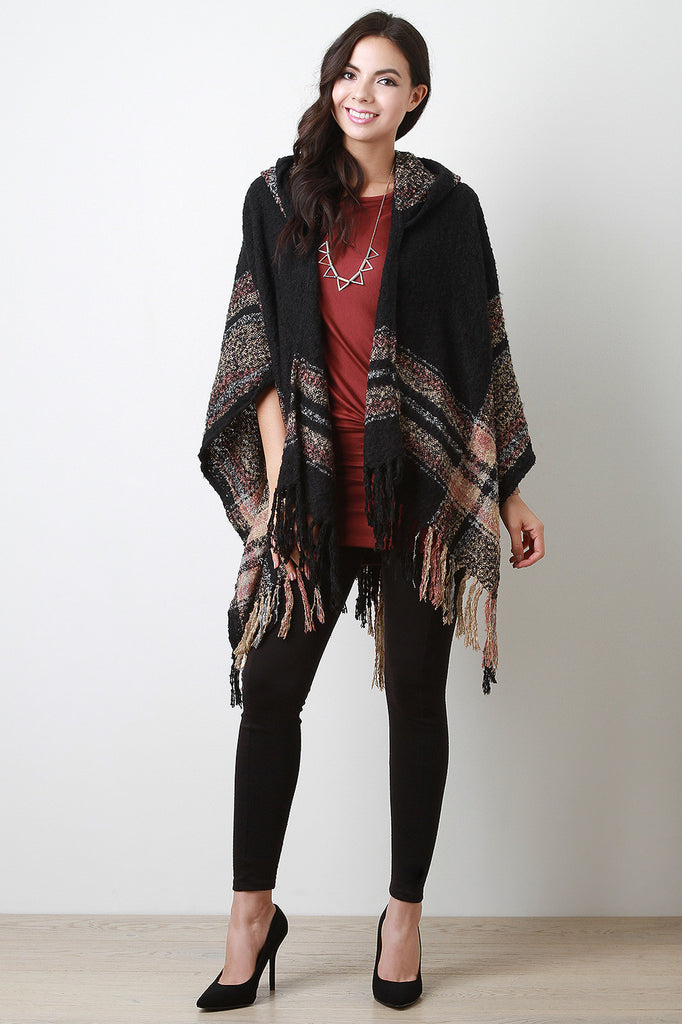 A hooded open front cardigan featuring a soft tufted texture knit, melange stripes design, and fringed handkerchief hemline. Accessories sold separately. 100% Acrylic.
