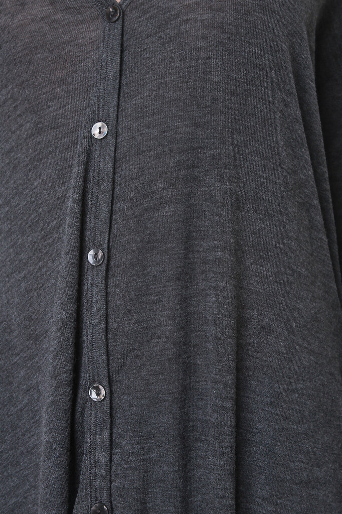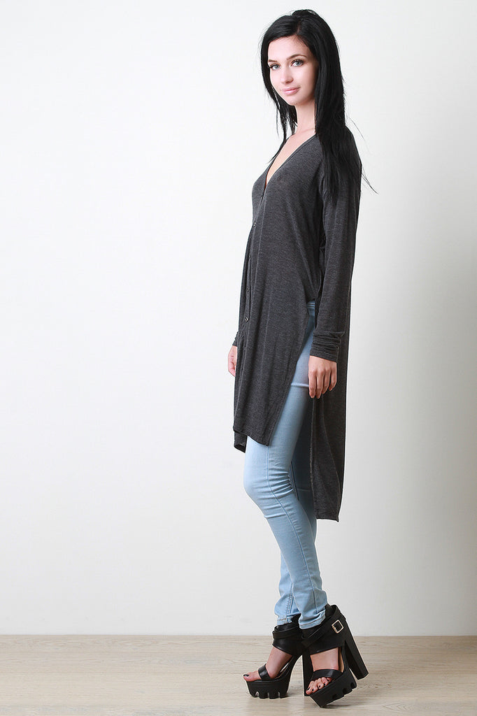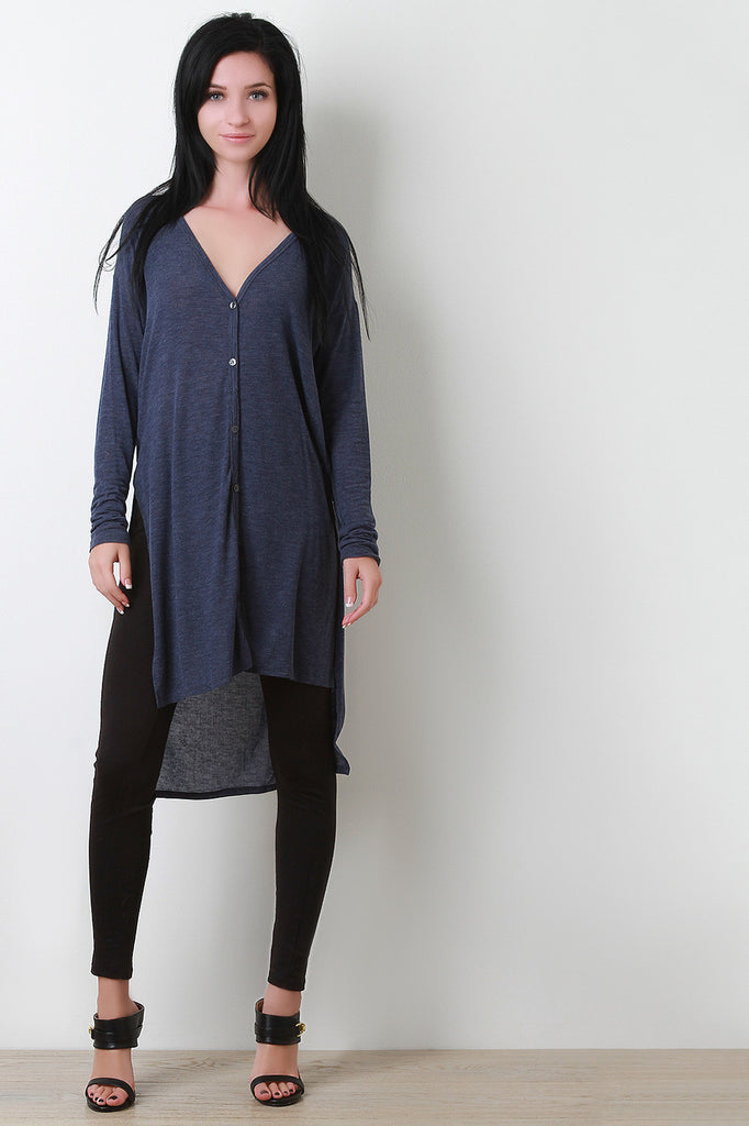 This feather weight knit sweater top features a v-neckline to a button-down front, long sleeves, side vent slits, and a boxy high low hemline. Accessories sold separately. 48% Polyester, 47% Rayon, 5% Spandex.