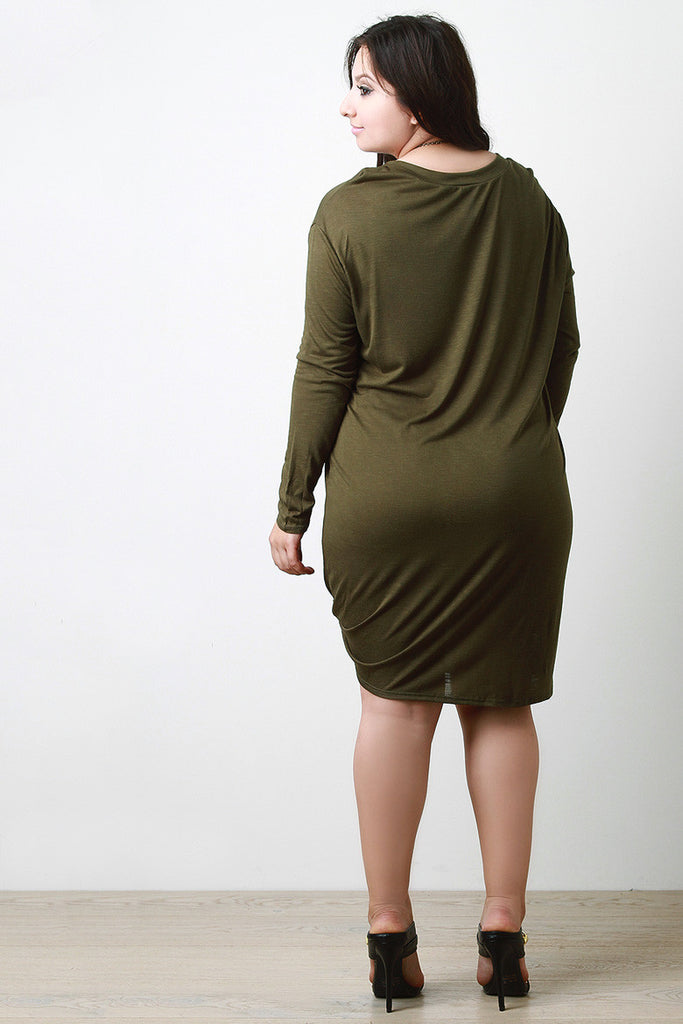 This plus size midi dress features a round neckline, long sleeves, and a knotted hem accent. Unlined. Accessories sold separately. Made in U.S.A. 95% Rayon, 5% Spandex.