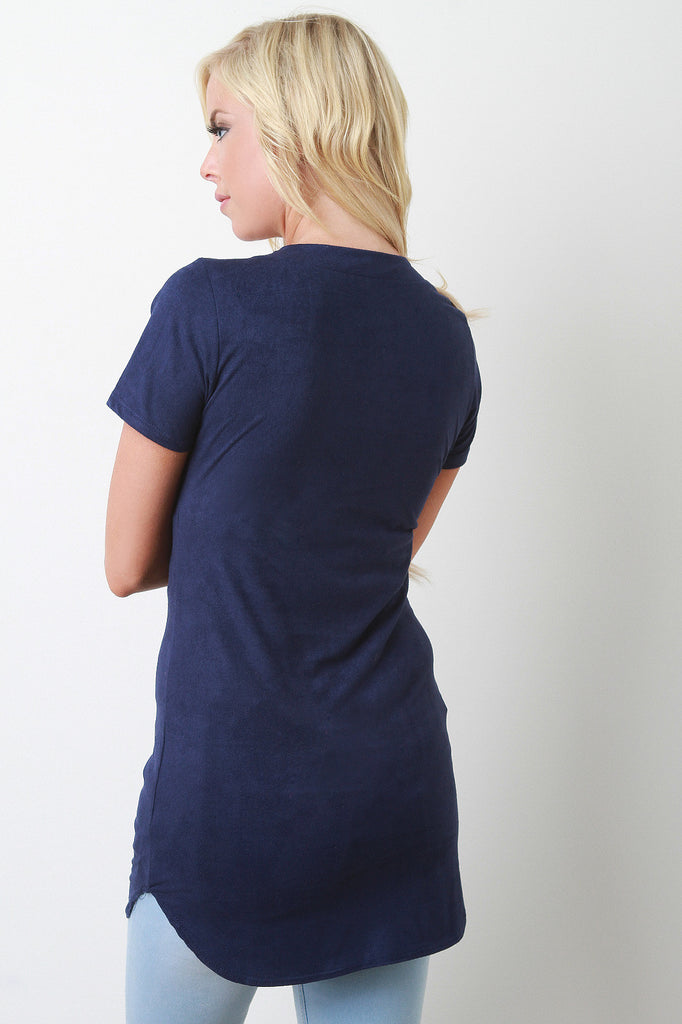 This vegan suede top features a v-neckline with lace up front, short sleeves, and a rounded hemline. Accessories sold separately. Made in U.S.A. 95% Polyester, 5% Spandex.