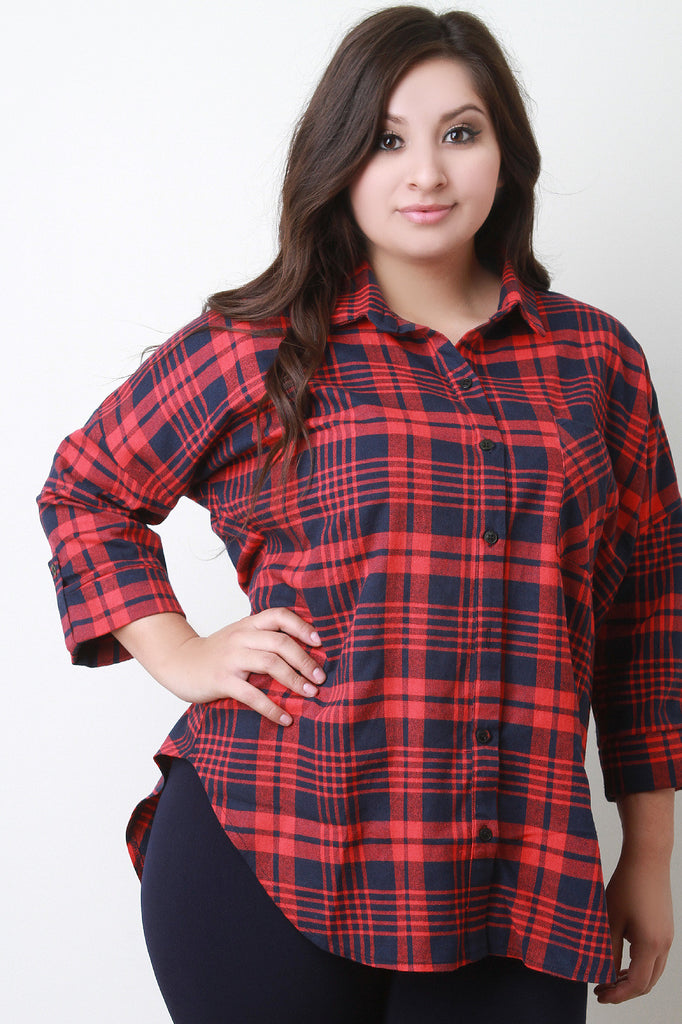 This plus size flannel top features a button up front to a classic collar neckline, left breast pocket, quarter-length sleeves, and a shirt tail hemline. Accessories sold separately. Made in U.S.A. 35% Polyester, 70% Cotton.