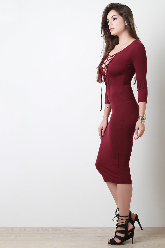 This jersey midi dress features a v-neckline with self-tie laces, three-quarter sleeves, and a stretchy sculpture fit. Accessories sold separately. Made in U.S.A. 95% Rayon, 5% Spandex.