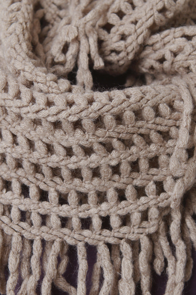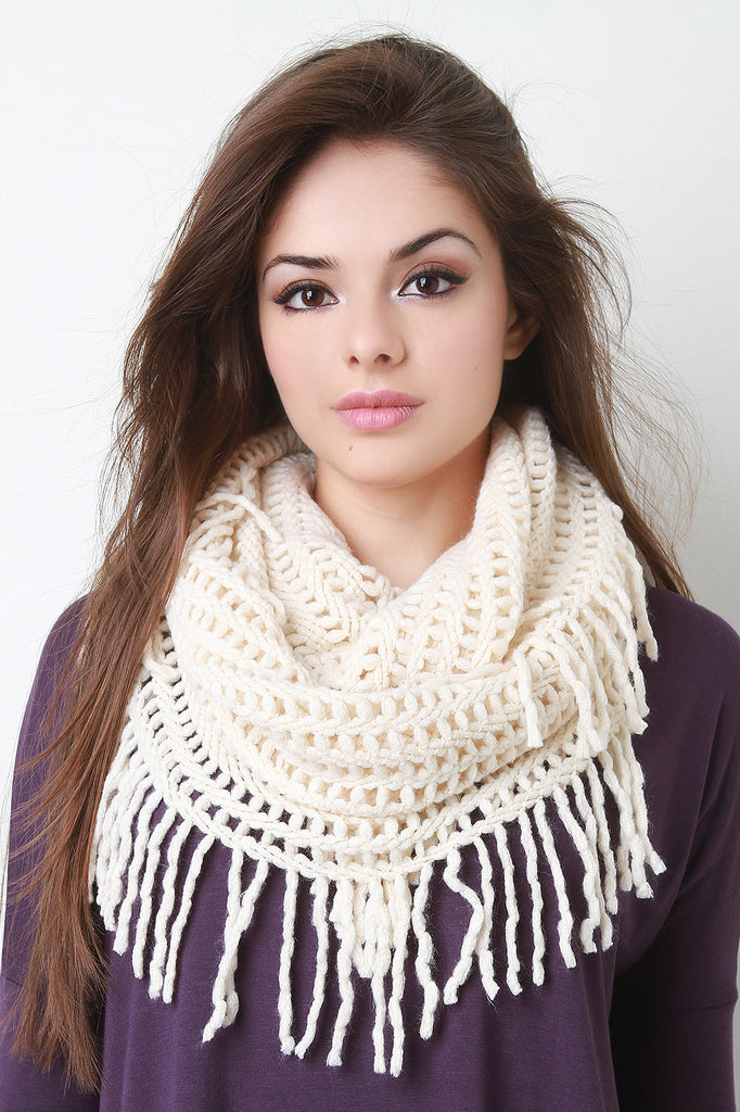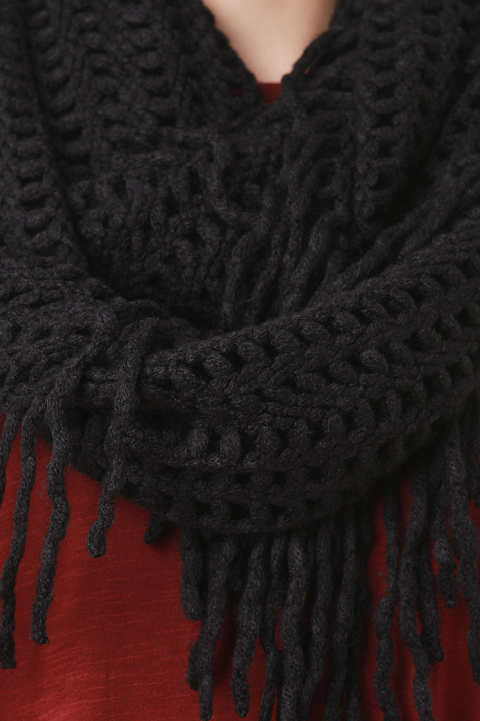 This open knit infinity scarf features solid coloring and fringe edges. 100% Acrylic.