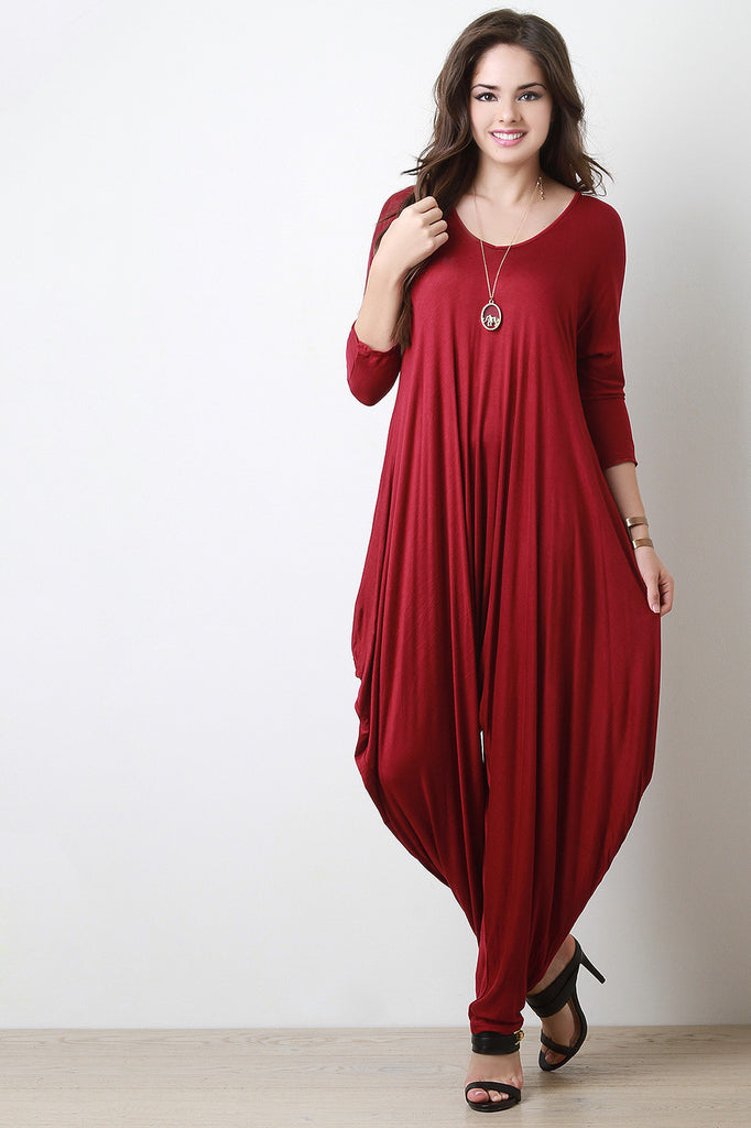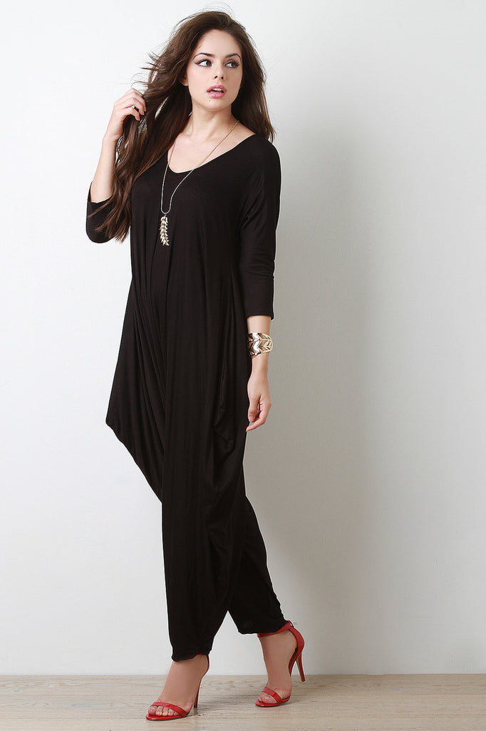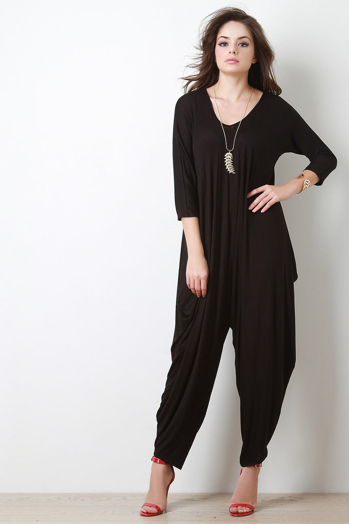 This jersey jumpsuit features a v-neckline, three-quarter sleeves, and draping harem pants bottom. Finished with a keyhole back. Accessories sold separately. Made in U.S.A. 95% Rayon, 5% Spandex.