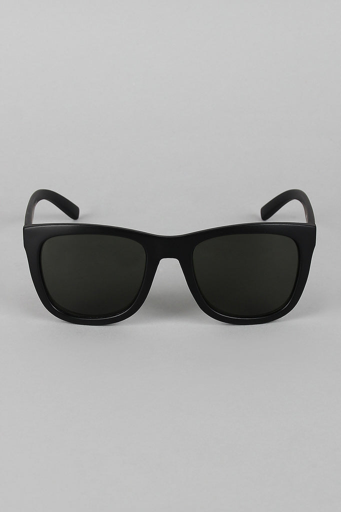 These matte sunglasses feature a rectangular lens with a slight cat eye, squared temple tips, and a thick nose bridge.