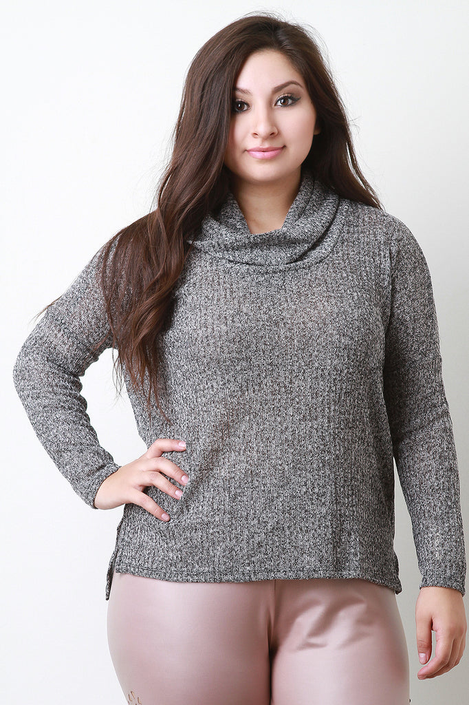 Marled Knit Cowl Neck Long Sleeves Slit Sweater Top