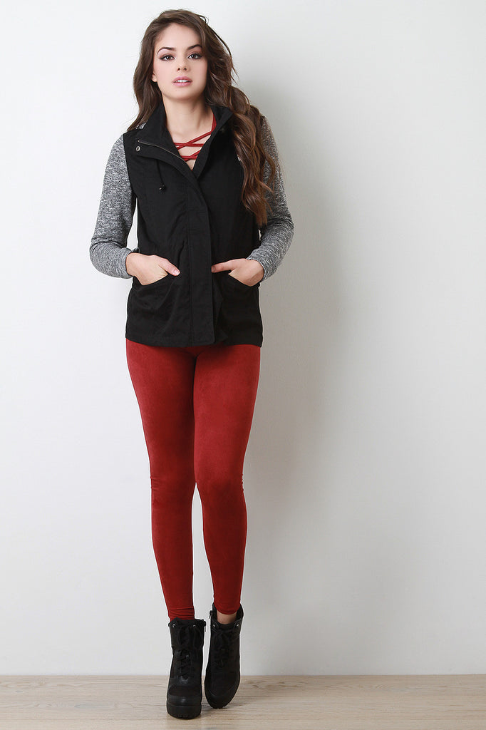This jacket features a zipper front with secure snap button closure, front flap pockets, contrasting marled knit long sleeves, and removable hoodie. Accessories sold separately. 100% Cotton. Contrast: 65% Cotton, 35% Polyester.