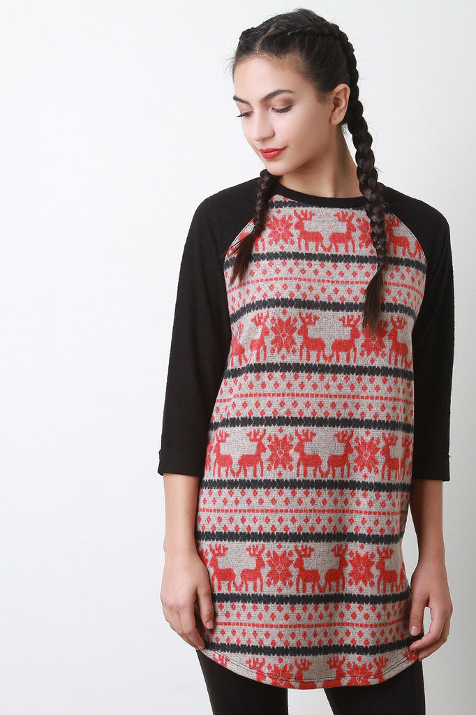 This soft knit top features reindeer pattern, solid raglan long sleeves, round neckline, and curved hem. Accessories sold separately. Made in U.S.A. Self: 96% Polyester, 4% Spandex. Contrast: 67% Polyester, 29% Rayon, 4% Spandex.