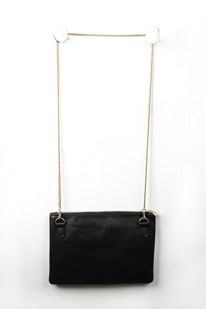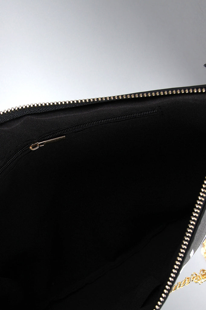 This bold bag features a printed parental advisory warning label on pebbled vegan leather with a top zipper closure and a removable double curb link shoulder chain (23" drop). The interior is fully lined with two slip pockets and one zipper pocket.