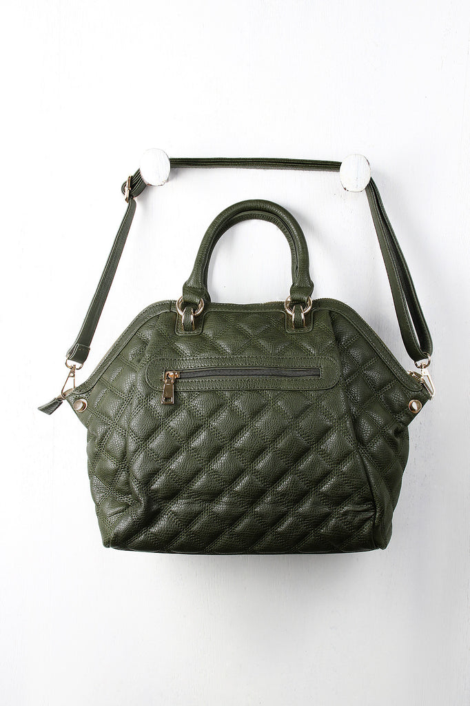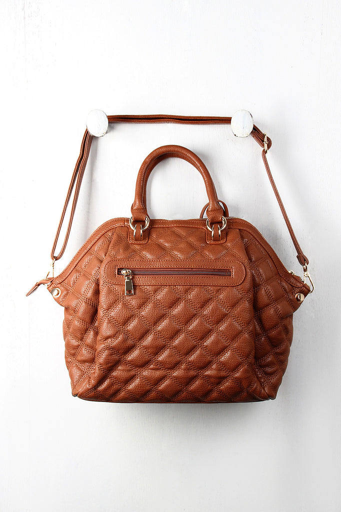 A hexagon-shaped handbag featuring quilted vegan leather, two rounded top handles, and a full-length zipper top. The interior is lined with satin striped fabric and features two slip pockets and one zipper pocket on the back wall. Complete with one exterior zipper pocket at the back, glossy round screw embellishments, and round purse feet. Bag includes an adjustable shoulder strap.