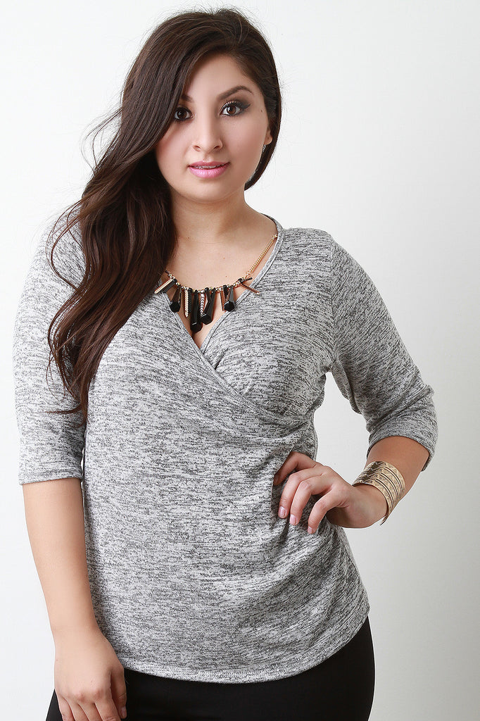 This  plus size  top, features a surplice neckline and quarter sleeves. Heathered design. Necklace is included and can be detached. Other accessories sold separately. 49% Rayon. 47% Polyester. 4% Spandex.