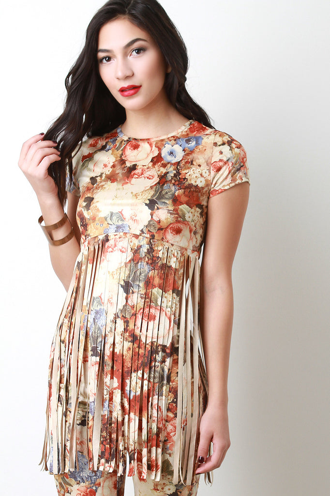 This soft microfiber top features floral print design, round neckline, short sleeves, and long cascading fringe hemline. Accessories sold separately. Made in U.S.A. 95% Polyester, 5% Spandex.