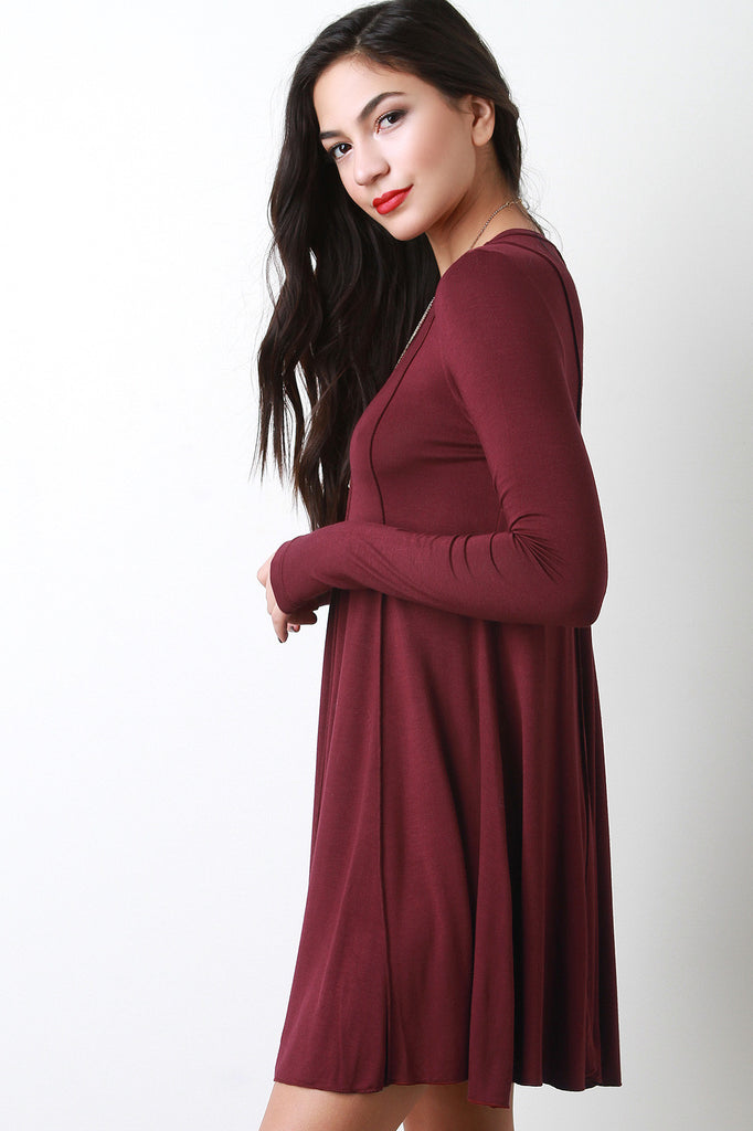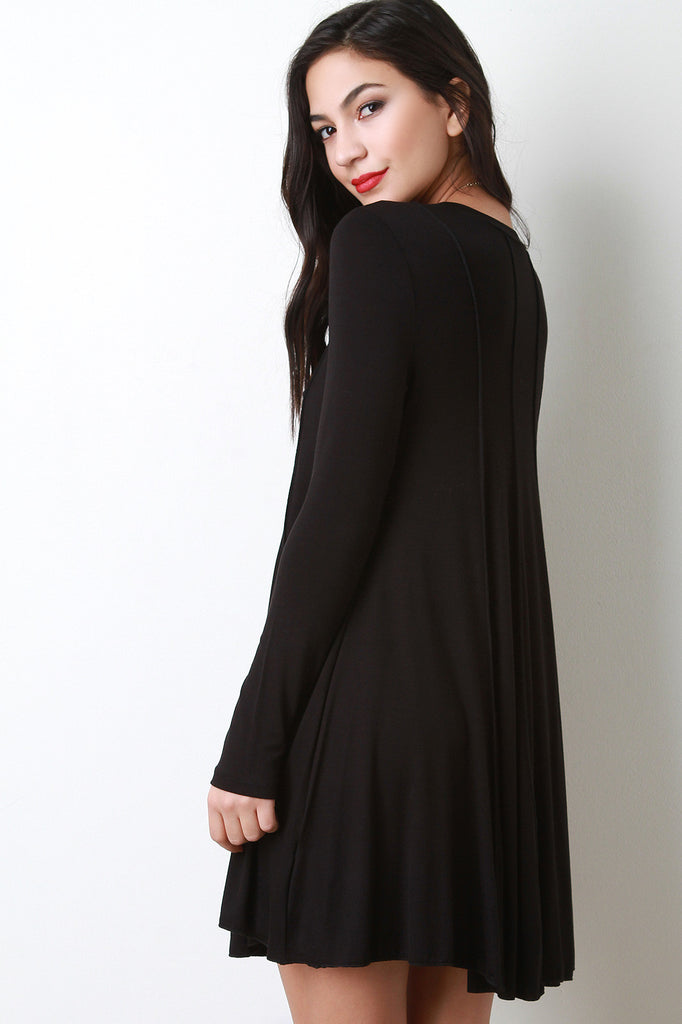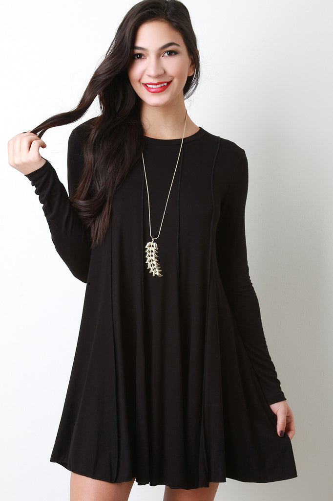 This jersey knit dress features a round neckline, long sleeves, vertical pinch stitch seams construction, and trapeze cut fit. Accessories sold separately. Made in U.S.A. 95% Rayon, 5% Spandex.