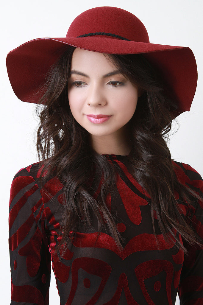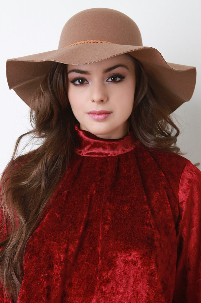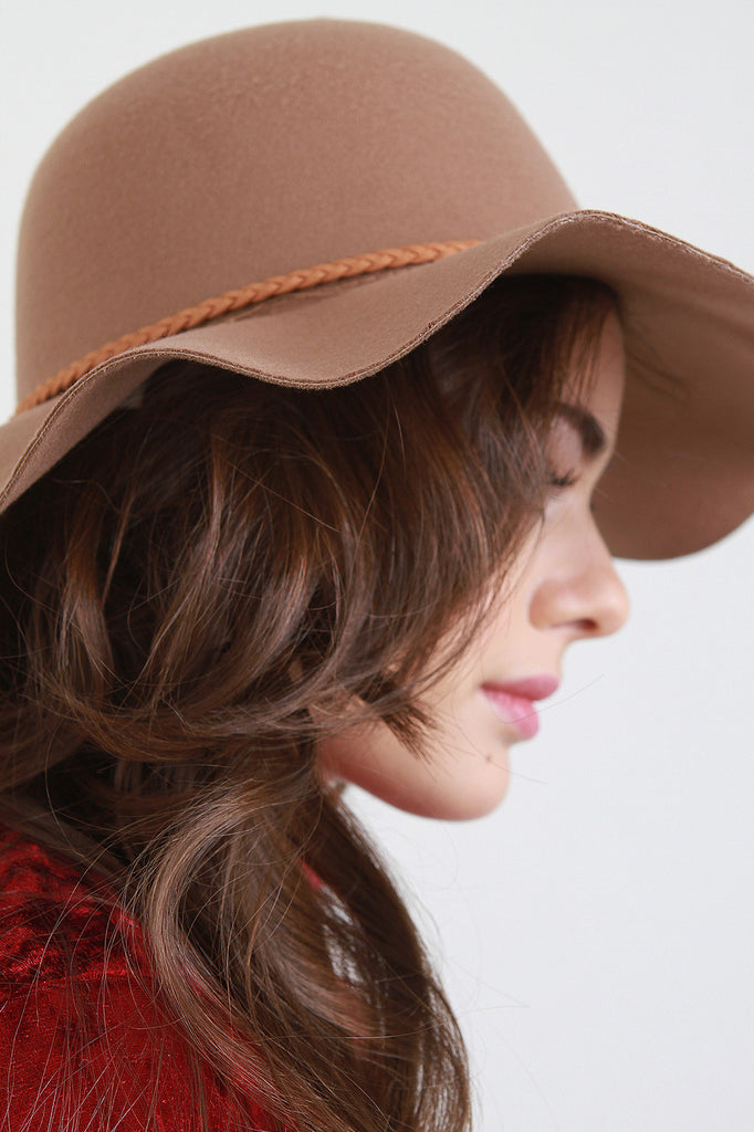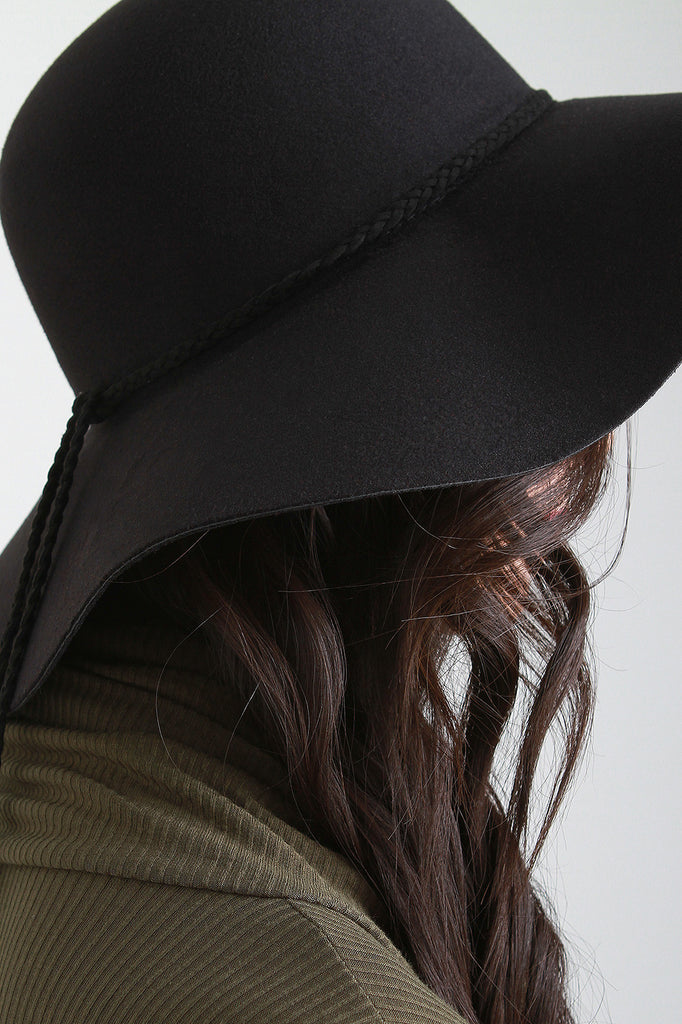 This floppy hat features a round crown, a braided trim with fringe and beads on the ends, and wide brim.