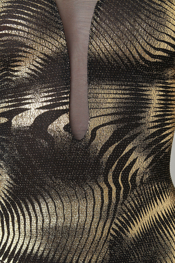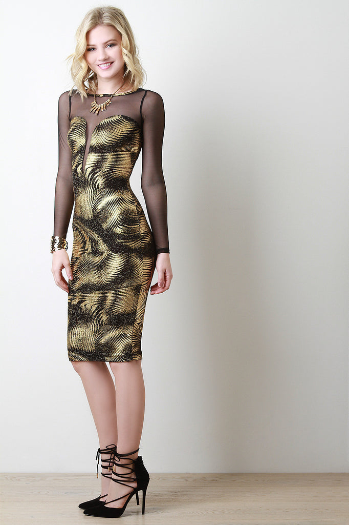 Get ready to semi-sheer mesh yoke including the long sleeves and back panel. The remainder of the dress starts with a plunging sweetheart neckline and features a festive metallic brush strokes print. Accessories sold separately. Made in USA. 83% Nylon, 12% Metallic, 5% Spandex.