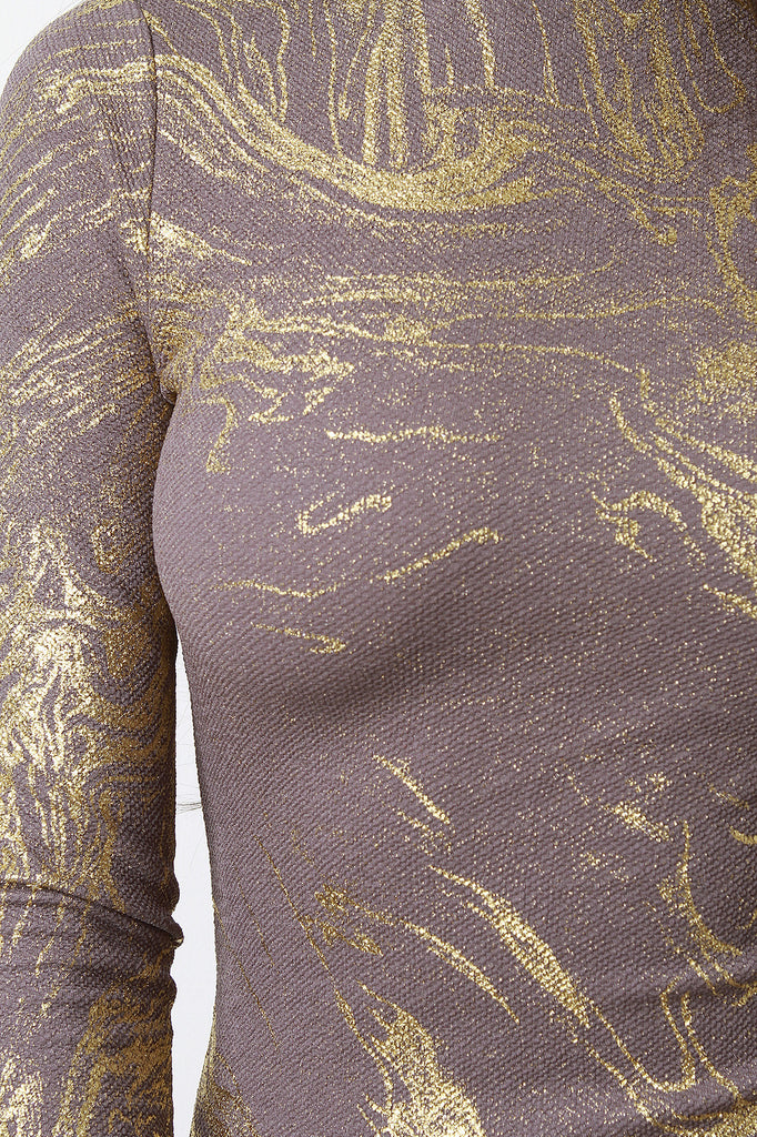 This midi dress features textured stretch knit, metallic swirl pattern, turtleneck, long sleeves, and open side. Accessories sold separately. Made in U.S.A. 97% Polyester, 3% Spandex.