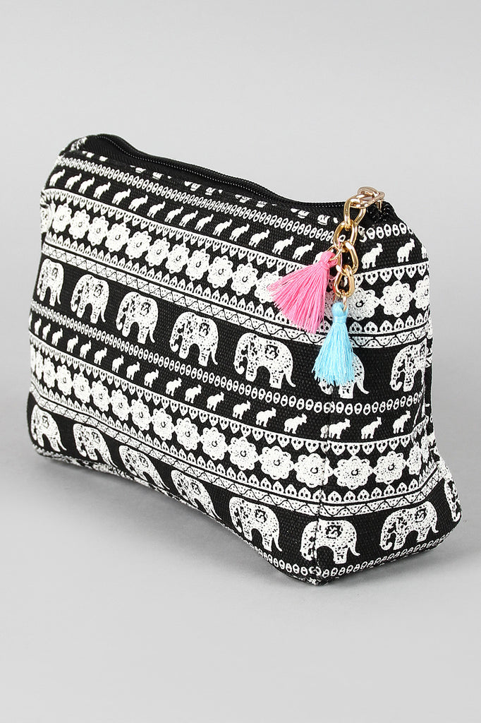 This monochrome elephant-patterned canvas pouch features a wider base and a tapered top, zipper closure with a double tassel zipper pull on a glossy curb link chain, and a lined interior.