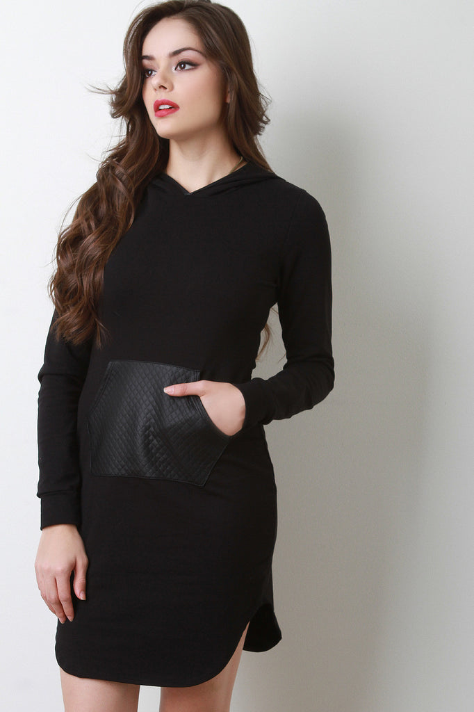 A long cuffed sleeves , and a quilted vegan leather kangaroo pocket. Finished with a round hemline. Accessories sold separately. Made in U.S.A. 92% Cotton, 8% Spandex.