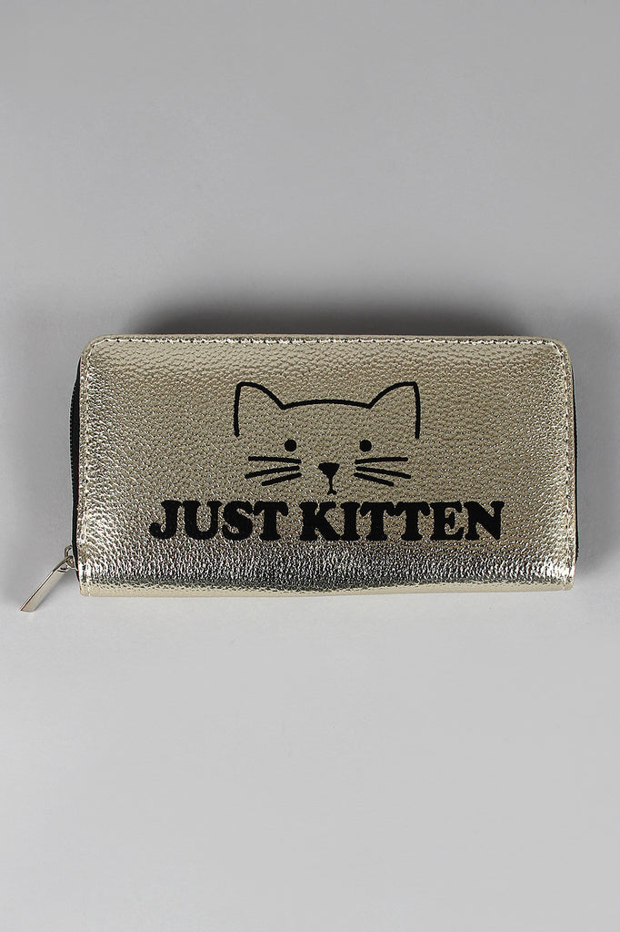 A clutch style walle t featuring metallic vegan leather, printed front design, and full zip-around closure. The interior features three main sections with gusseted sides, card slots, and zipper pocket for coins.